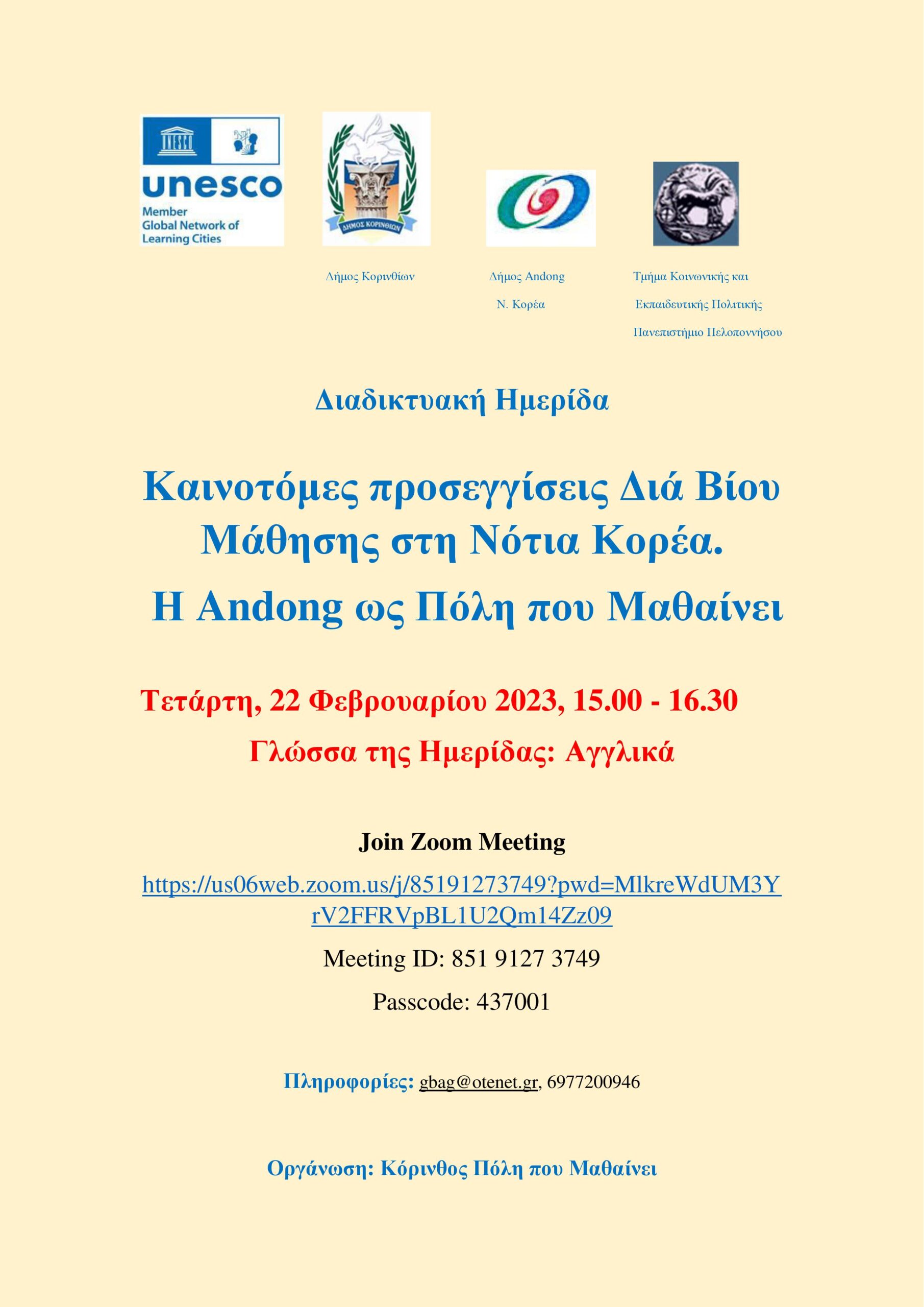 Θα παρουσιαστεί η Διά Βίου Μάθηση μιας μικρής πόλης, 160.000 κατοίκων, της Andong. Η παρουσίαση θα γίνει από τον επικεφαλής της Ομάδας Διά Βίου Μάθησης της πόλης. Μέσω αυτής της παρουσίασης θα αναδυθεί και το σύστημα Διά Βίου Μάθησης της Νότιας Κορέας.