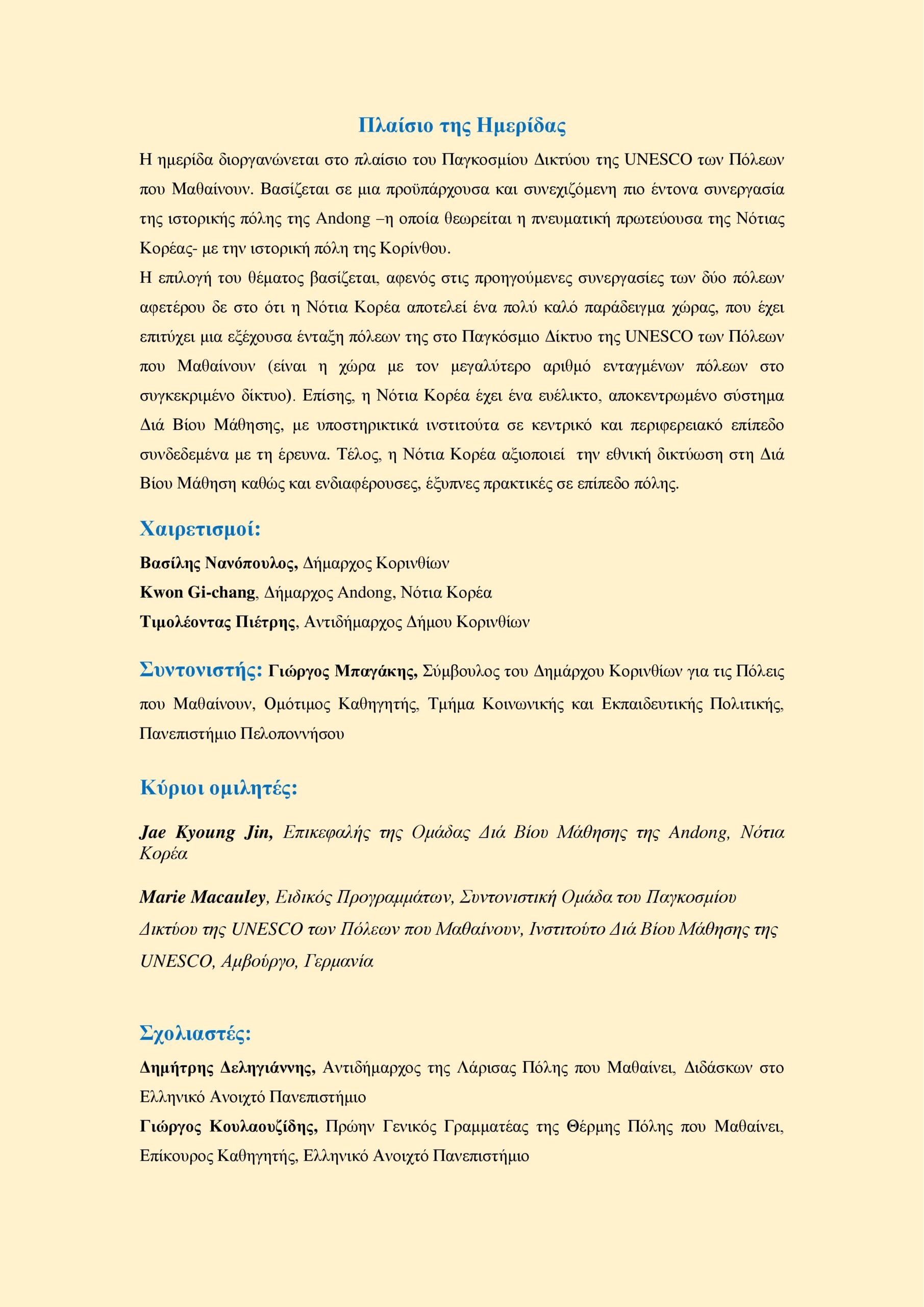 Στην ημερίδα θα χαιρετίσουν ο Δήμαρχος Κορινθίων Βασίλειος Νανόπουλος και ο Δήμαρχος της Andong της Νότιας Κορέας.