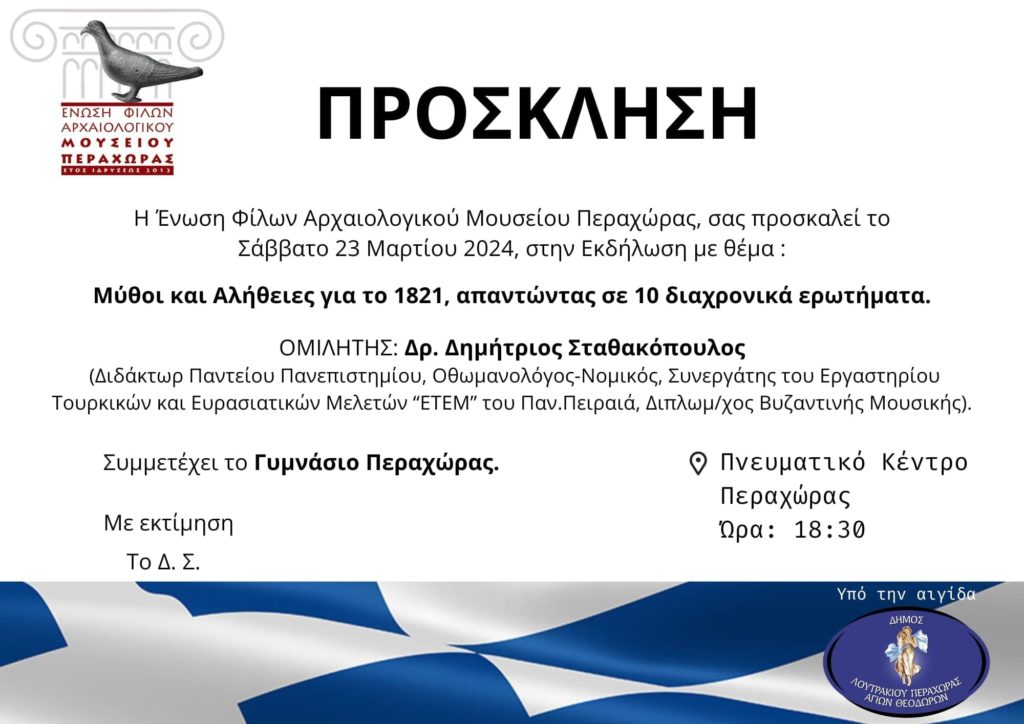 Το θέμα της εκδήλωσης είναι Μύθοι και Αλήθειες για το 1821 και ο Νομικός και Οθωμανολόγος Δημήτρης Σταθακόπουλος θα μας μεταδώσει τις πλούσιες γνώσεις του για την Επανάσταση του 1821.