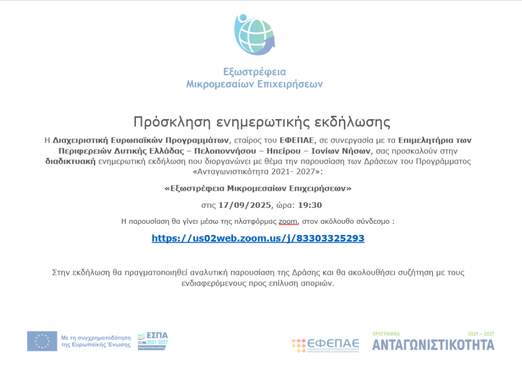 Η Διαχειριστική Ευρωπαϊκών Προγραμμάτων, εταίρος του ΕΦΕΠΑΕ, σε συνεργασία με τα Επιμελητήρια των Περιφερειών Δυτικής Ελλάδας – Πελοποννήσου – Ηπείρου – Ιονίων Νήσων, σας προσκαλούν στην διαδικτυακή ενημερωτική εκδήλωση που διοργανώνει με θέμα την παρουσίαση των Δράσεων του Προγράμματος «Ανταγωνιστικότητα 2021- 2027»: